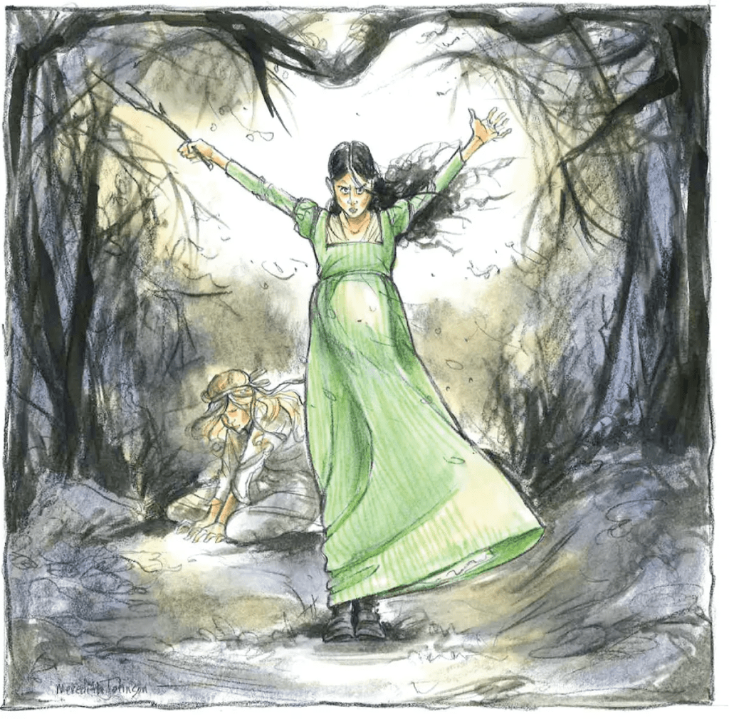 The desperate cries of the miller and his wife woke the neighbors. They came to assist the frantic couple. Suddenly, a sharp-eyed farmer gave a shout and pointed towards a strange light at the edge of the woods. A few townsmen followed him out into the field and saw Bloody Mary standing beside a large oak tree, holding a magic wand that was pointed towards the miller’s house. She was glowing with an unearthly light as she set her evil spell upon the miller’s daughter.