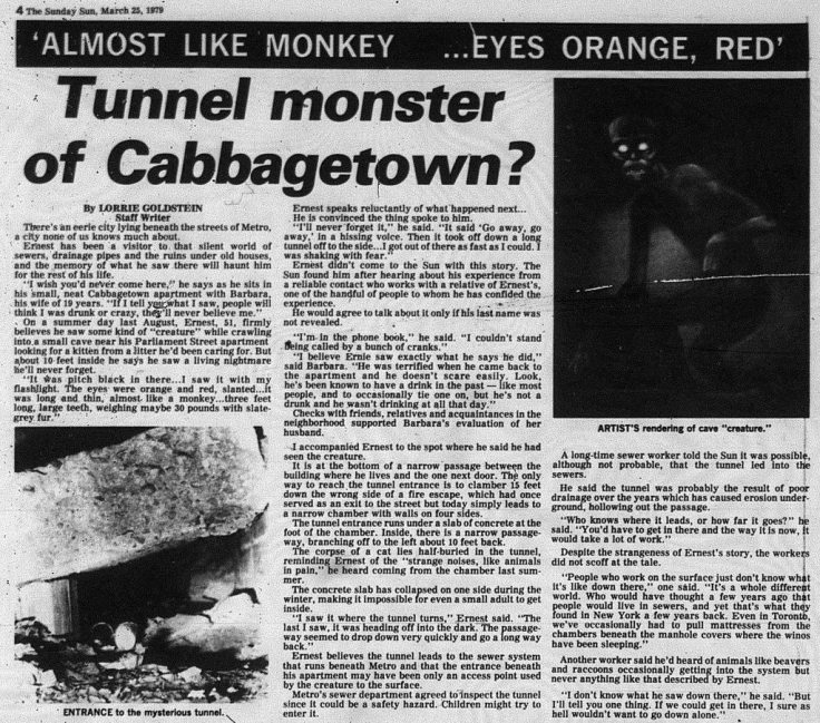 The Toronto Tunnel Monster (also known as the Cabbagetown Tunnel Monster) is a cryptid that is an urban legend originating from a single reported sighting in 1978. A Parliament Street resident named Ernest claimed to have encountered a strange, humanoid creature while searching for a lost kitten in a narrow cave-like opening near his apartment.